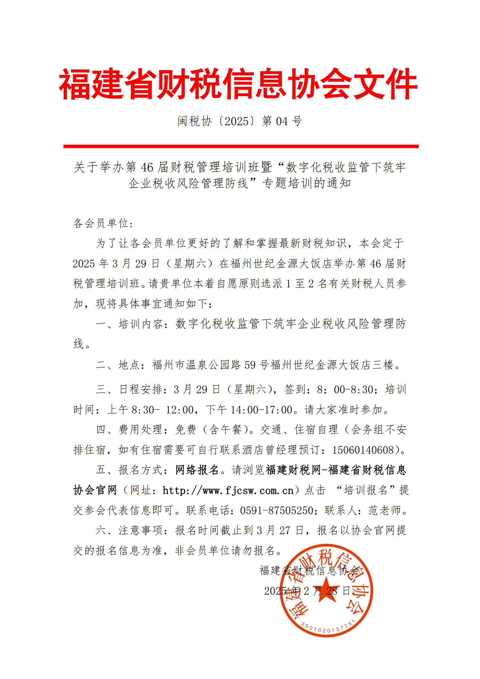 為了讓各會員單位更好的了解和掌握最新財稅知識,本會定于2025年3月29日(星期六)在福州世紀(jì)金源大飯店舉辦第46屆財稅管理培訓(xùn)班。請貴單位本著自愿原則選派1至2名有關(guān)財稅人員參加。