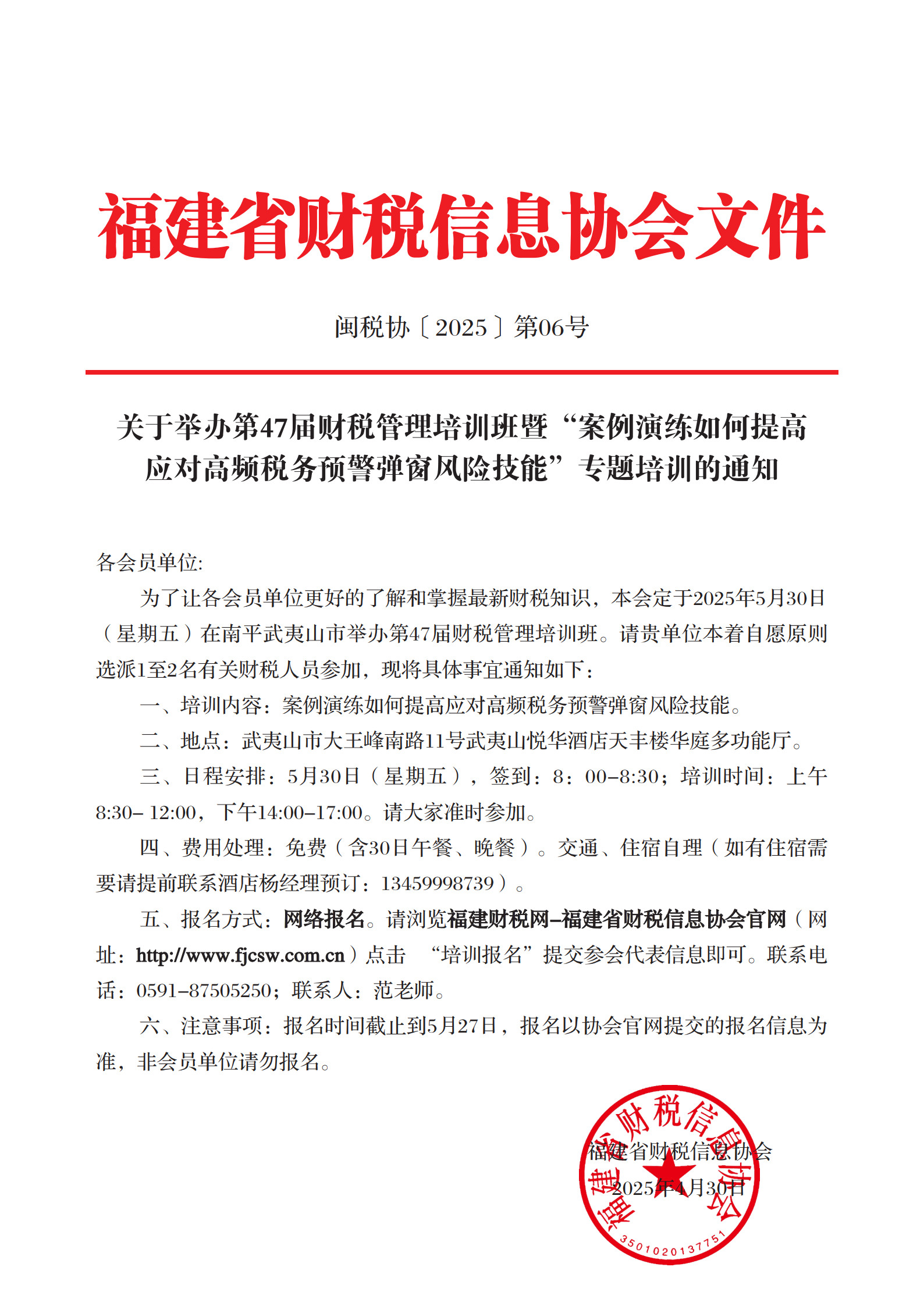 本會定于2025年5月30日(星期五)在南平武夷山市舉辦第47屆財稅管理培訓(xùn)班,請貴單位本著自愿原則選派1至2名有關(guān)財稅人員參加。