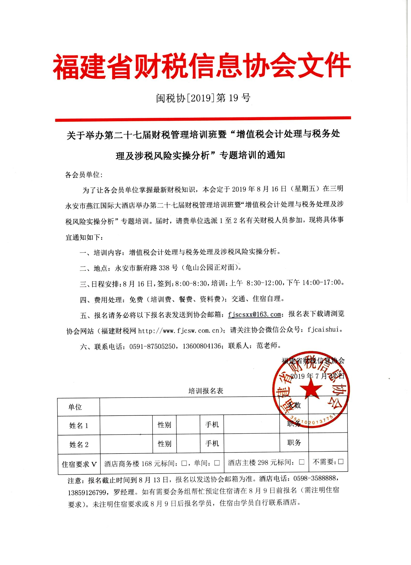為了讓各會員單位掌握最新財稅知識,本會定于2019年8月16日(星期五)在三明永安市燕江國際大酒店舉辦第二十七屆財稅管理培訓(xùn)班暨“增值稅會計處理與稅務(wù)處理及涉稅風(fēng)險實(shí)操分析”專題培訓(xùn)。