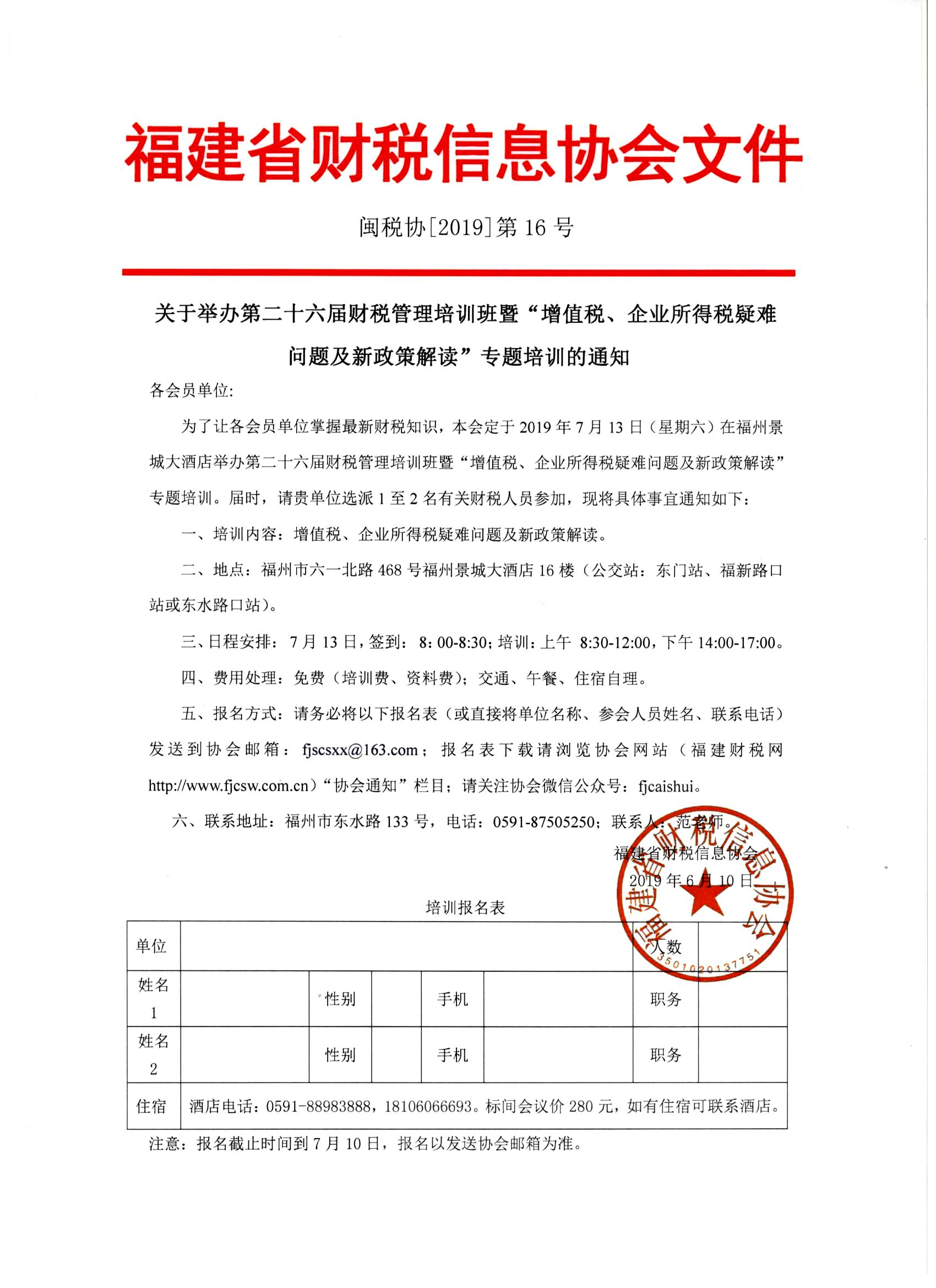 為了讓各會員單位掌握最新財稅知識,本會定于2019年7月13日(星期六)在福州景城大酒店舉辦第二十六屆財稅管理培訓(xùn)班暨“增值稅、企業(yè)所得稅疑難問題及新政策解讀”專題培訓(xùn)。