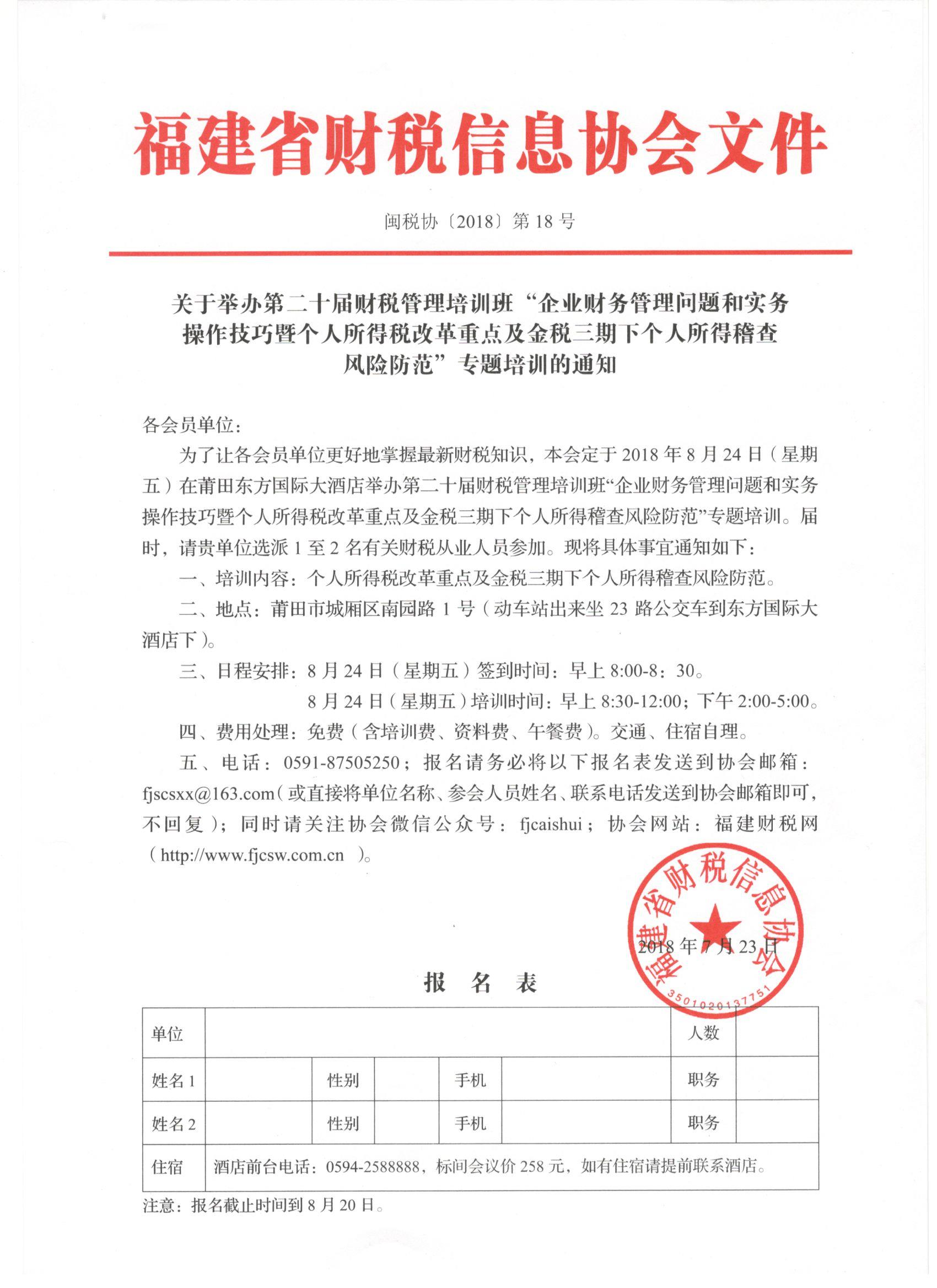 為了讓各會員單位更好地掌握最新財稅知識,本會定于2018年8月24日(星期五)在莆田東方國際大酒店舉辦第二十屆財稅管理培訓班“企業(yè)財務管理問題和實務操作技巧暨個人所得稅改革重點及金稅三期下個人所得稽查風險防范”專題培訓。