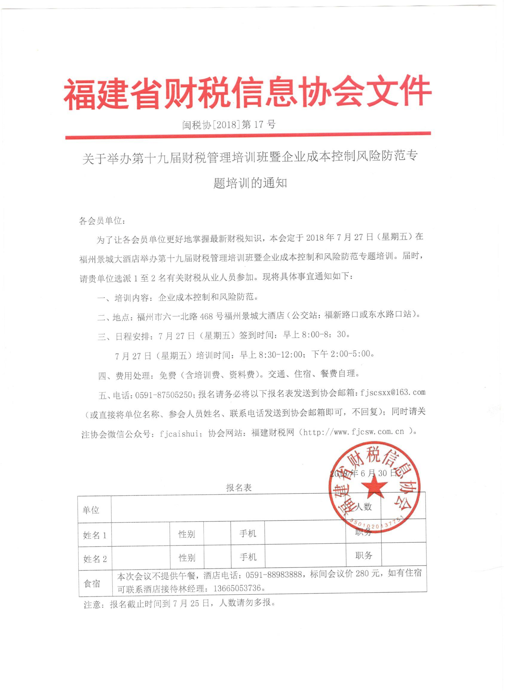 關(guān)于舉辦第十九屆財稅管理培訓班暨企業(yè)成本控制和風險防范專題培訓的通知