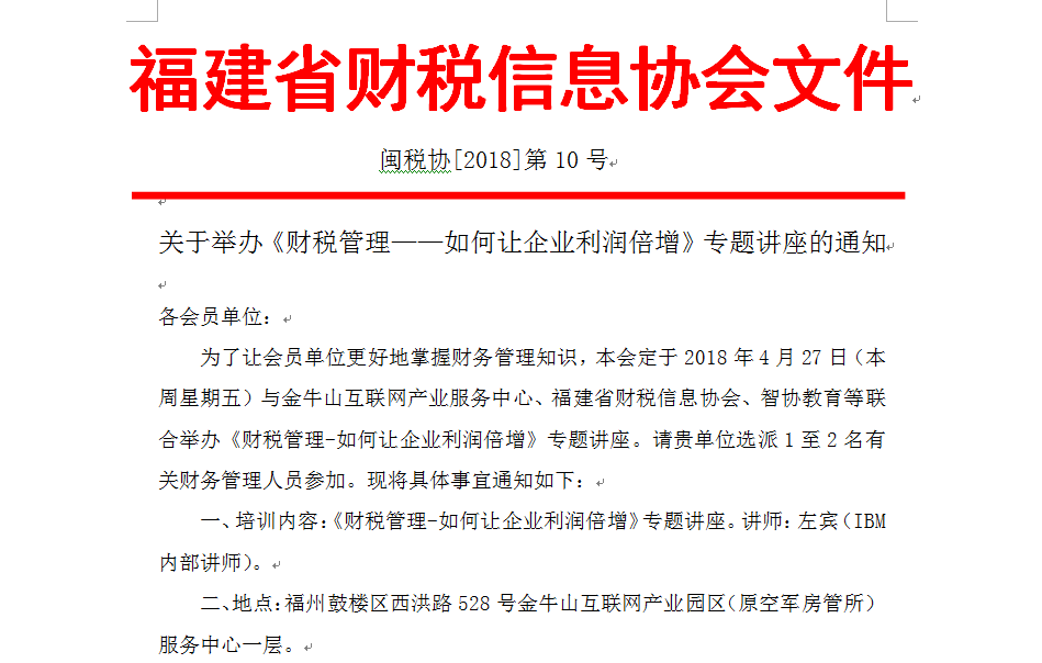 為了讓會員單位更好地掌握財務管理知識,本會定于2018年4月27日(本周星期五)與金牛山互聯(lián)網(wǎng)產(chǎn)業(yè)服務中心、福建省財稅信息協(xié)會、智協(xié)教育等聯(lián)合舉辦《財稅管理-如何讓企業(yè)利潤倍增》專題講座。