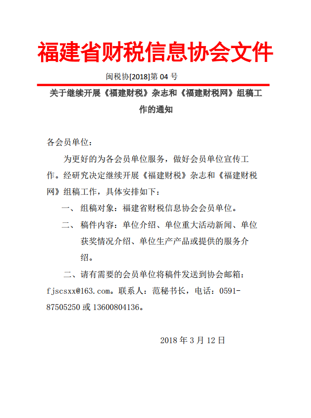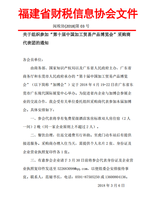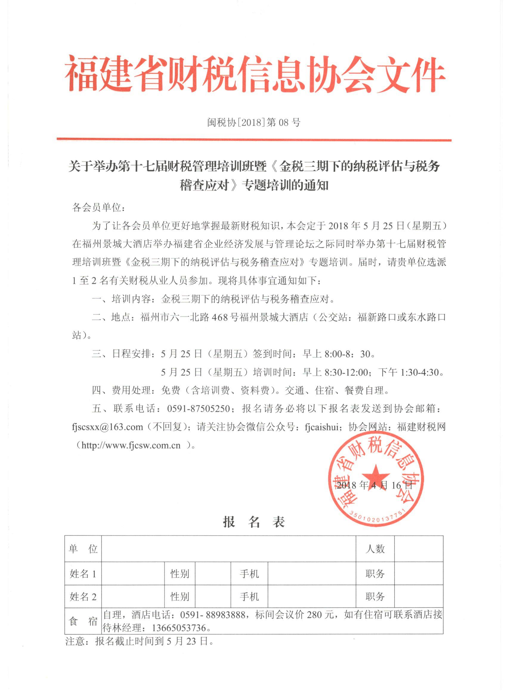 為了讓各會員單位更好地掌握最新財稅知識,本會定于2018年5月25日(星期五)在福州景城大酒店舉辦第十七屆財稅管理培訓班暨《金稅三期下的納稅評估與稅務稽查應對》專題培訓。