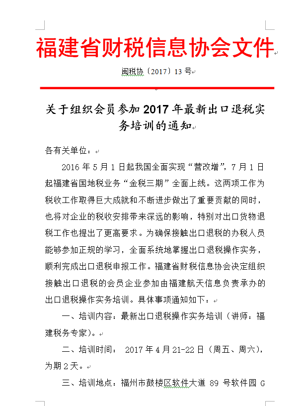 為了讓各會(huì)員單位更好地掌握最新財(cái)稅知識(shí),特組織會(huì)員參加2017年4月25-26日在福建銀河花園大飯店三樓舉辦的 “金稅三期系統(tǒng)下的稅務(wù)稽查風(fēng)險(xiǎn)管控”精講班培訓(xùn)。