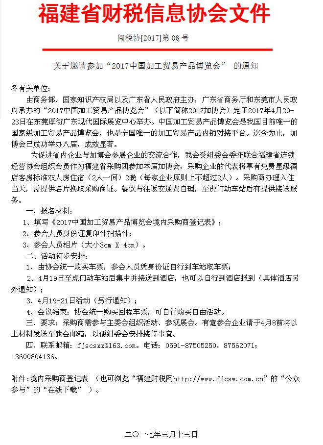 關(guān)于邀請(qǐng)參加“2017中國(guó)加工貿(mào)易產(chǎn)品博覽會(huì)” 的通知