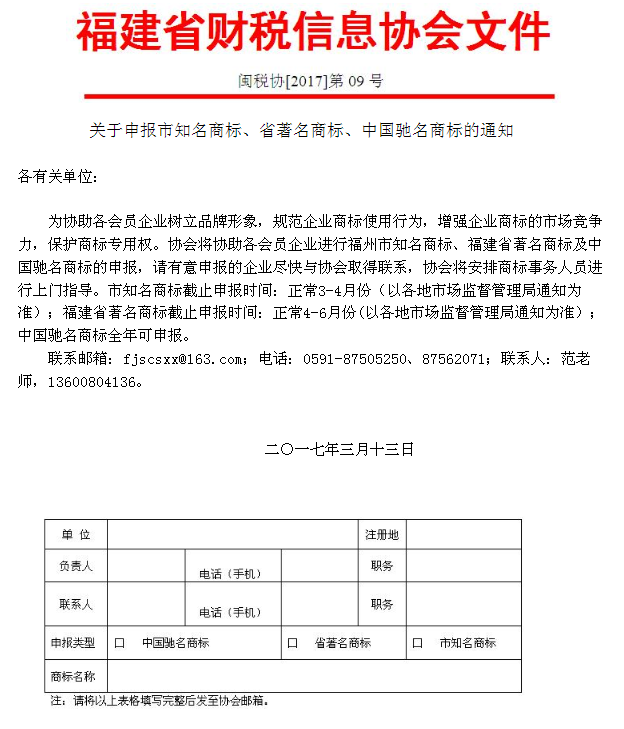 關(guān)于申報(bào)市知名商標(biāo)、省著名商標(biāo)、中國(guó)馳名商標(biāo)的通知