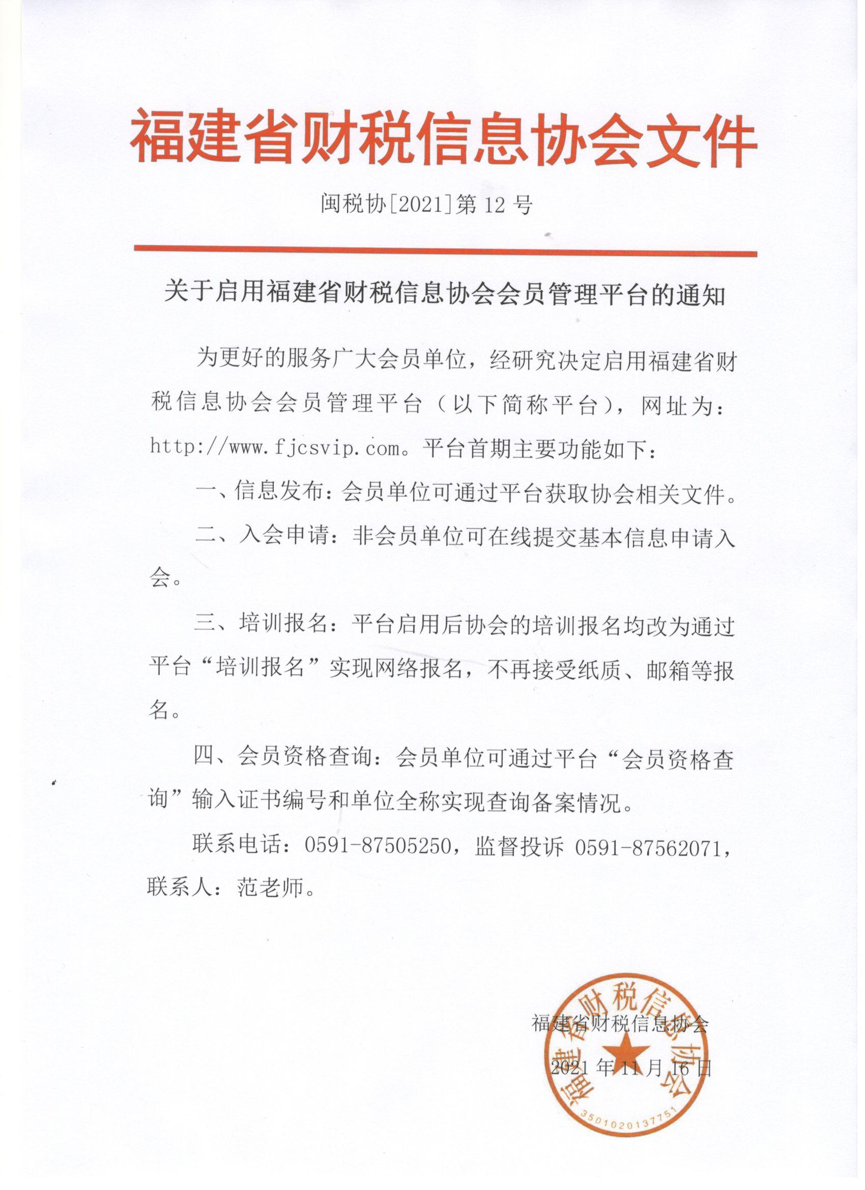 關(guān)于啟用福建省財(cái)稅信息協(xié)會(huì)會(huì)員管理平臺(tái)的通知